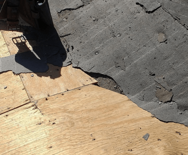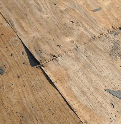 This image shows the problem which occurs when the plywood isn’t properly spaced. The warping is cause by the swelling that happens when the moisture in the air increases. The plywood swells and it causes it to buckle. The nails loosen and this warping cuts the backs of the underlayment and shingles.