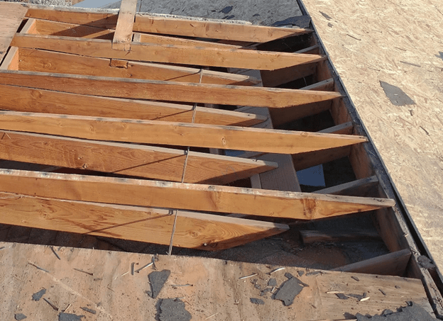 This phot show that the rafters were cut short so to be able to use them the person doing that project cut a 2X$ and nailed it to the top of the rafter they cut wrong. When looking at the photo you can see that the thinnest part of the new 2 x4 rater extension is used to support all the weight. I don’t know how these didn’t split. Besides this all the plywood is 3/8 and not the ½” required