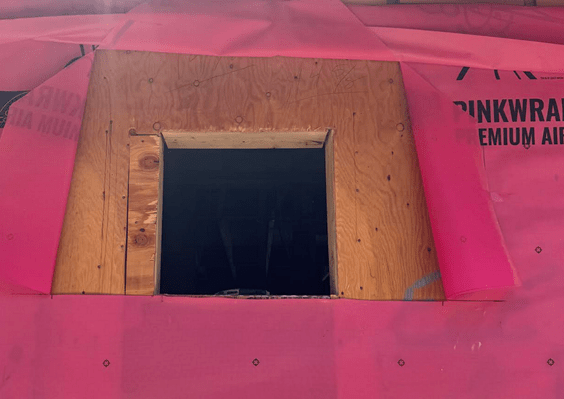 After you’ve cut your rough opening to size you then cut out the opening into the fabric of your house wrapping. You should notice that my bottom line is longer than my opening. This is so I can extend the cut to the width of the sealing tape.